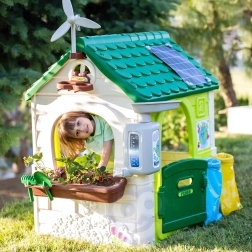Domek Feber Eco został zaprojektowany tak, aby umożliwić dzieciom odkrywanie piękna natury i uczyć je o środowisku poprzez zabawę. Wyposażony jest w dwa kosze do recyklingu w kolorach niebieskim i żółtym, mały ogródek z donicami oraz narzędzia do ogrodnictwa. Dzieci mogą sadzić nasiona i obserwować wzrost roślin.