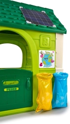 Domek obejmuje dwa kosze do recyklingu w kolorach niebieskim i żółtym, które uczą dzieci znaczenia odpadów i ich prawidłowej segregacji.