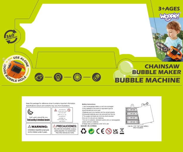 Zabawny pistolet do baniek w kształcie piły marki WOOPIE zamieni każde popołudnie w ogrodzie w show pełne baniek. Dzięki odłączanej „pile” szybko zmienisz wygląd na stylowy generator baniek, a automatyczne dmuchanie, efekty świetlne i obrót wylotu o 360° tworzą oszałamiający spektakl wizualny. W zestawie są 2 buteleczki płynu; zabawka jest lekka, przenośna i idealna dla dzieci od 3 lat.