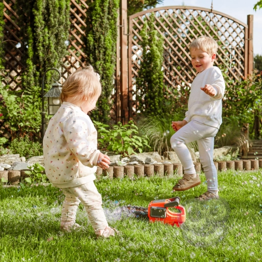 Obrotowy wylot ze światłami tworzy dynamiczny strumień baniek w każdym kierunku – idealne widowisko do zabaw w ogrodzie i na dziecięcych przyjęciach.