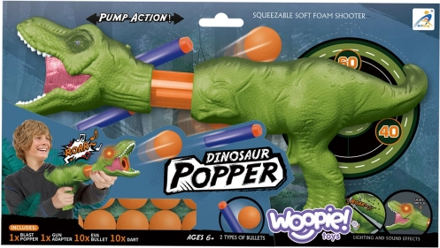 Zabawna dziecięca wyrzutnia w kształcie dinozaura marki WOOPIE zapewnia dynamiczną zabawę w domu i w ogrodzie. Załaduj piankowe kulki lub piankowe strzałki, naciągnij i strzelaj do celów. Zabawka jest łatwa w obsłudze, lekka i poręczna. O żywą atmosferę zadbają efekty świetlne (świecące oczy) i efekty dźwiękowe (RYK!). Świetny pomysł na prezent dla dzieci od 3 lat.