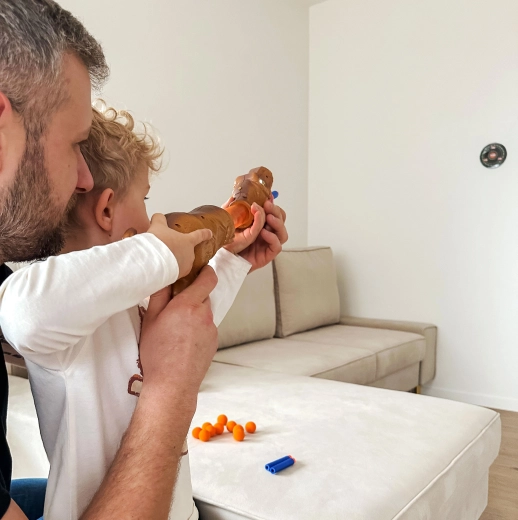 Dinozaurowy blaster WOOPIE zamieni każdą dziecięcą misję w przygodę. Wystarczy włożyć piankową kulkę albo założyć adapter do strzałek, naciągnąć głowę „T-Rexa” i puścić – i zabawa może się zacząć. Dzięki długiemu zasięgowi i prostej obsłudze dzieci mogą samodzielnie lub z kolegami urządzać zawody w strącaniu celów.