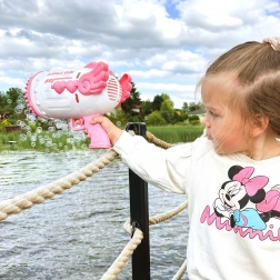 Zabawny pistolet do baniek WOOPIE zamieni każdą zabawę w magiczną atrakcję. Dzięki 91 otworom tworzy ogromną liczbę baniek po jednym naciśnięciu spustu. Jest łatwy w obsłudze, idealny na zewnątrz i do domu, a w zestawie znajdziesz także 2 buteleczki z płynem, akumulator i kabel do ładowania – wystarczy naładować, zanurzyć i bąbelkowa zabawa może się zacząć.