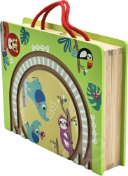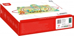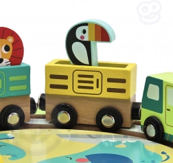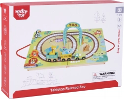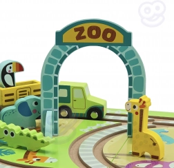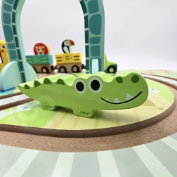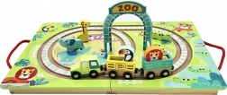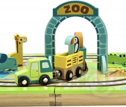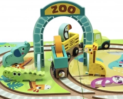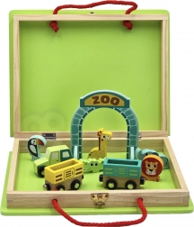 - Zawartość zestawu: drewniane tory w formie kuferka, lokomotywa i wagoniki na magnes, 5 figurek zwierząt, składana brama ZOO