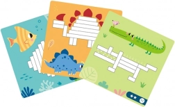 Kolorowe karty z motywami zwierzątek i wzorów prowadzą dzieci krok po kroku, a jednocześnie zostawiają przestrzeń na swobodne tworzenie.