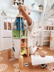 Ta dopracowana w detalach rakieta kryje aż 12 tematycznych pomieszczeń (np. sypialnia, sala operacyjna lub laboratorium), które zachęcają dzieci do swobodnej zabawy i opowiadania historii. Dzięki odłączanym sekcjom i interaktywnym elementom dzieci uczą się logiki, cierpliwości i współpracy.