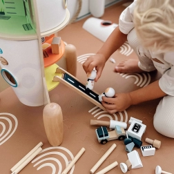Zabawka wykonana jest głównie z drewna, uzupełniona wysokiej jakości plastikiem i wykończona nietoksycznym lakierem. Jest trwała, estetycznie wykonana i zaprojektowana do długotrwałej zabawy w pokoju dziecięcym. Wspiera wyobraźnię, kreatywność oraz motorykę małą.