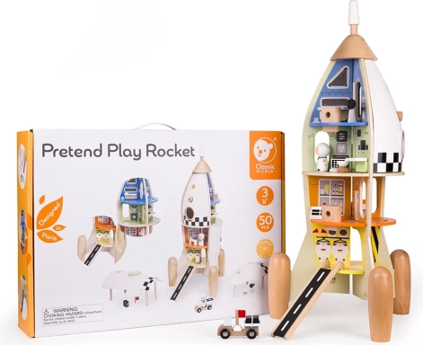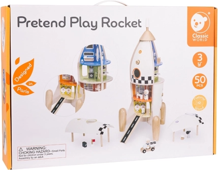 Odkryj świat wyobraźni z tą drewnianą rakietą CLASSIC WORLD – dużą, kolorową i dopracowaną zabawką dla dzieci od 3 lat. Oferuje wielopoziomową stację kosmiczną z pokojami, które wspierają kreatywność, motorykę małą oraz naukę kolorów i kształtów. Solidne wykonanie z drewna, elementy z plastiku i nietoksyczny lakier gwarantują bezpieczną i trwałą zabawę.