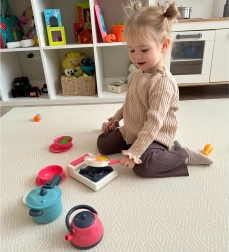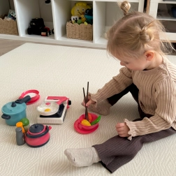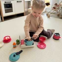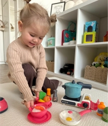 Zestaw wykonano z bezpiecznych materiałów, a wierne odwzorowanie prawdziwych narzędzi kuchennych gwarantuje bezpieczeństwo i trwałość. Do tej zabawki nie są potrzebne baterie, a dodatkowo jest kompaktowa, co ułatwia jej przechowywanie.