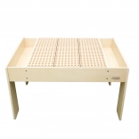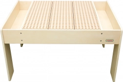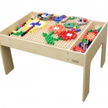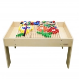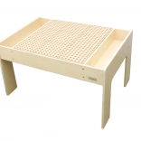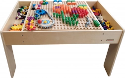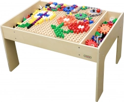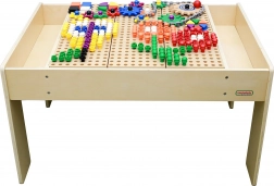 Stół ma stabilną drewnianą konstrukcję oraz praktyczne boczne przegrody do przejrzystego przechowywania elementów. Dzięki dużej powierzchni roboczej przy stole wygodnie bawi się jednocześnie więcej dzieci – idealny do pokoju dziecięcego, kącika lub sali zabaw.