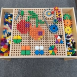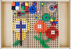 Solidna perforowana płyta oferuje mnóstwo miejsca na tworzenie wzorów i konstrukcji. Otwory są przygotowane na kołeczki i śrubki, dzięki czemu dzieci łatwo łączą kształty, kolory i pomysły konstrukcyjne.