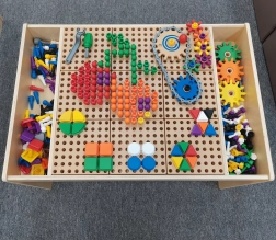 Drewniany edukacyjny stół Masterkidz do kreatywnej nauki STEM oferuje panel 63 × 63 cm, w który dzieci wpinają kolorowe kołeczki, śrubki i koła zębate. Powstają w ten sposób oryginalne wzory i działające mechanizmy, które rozwijają małą motorykę, koordynację ręka–oko oraz logiczne myślenie. Dwa boczne koszyki trzymają akcesoria pod ręką, a przy stole wygodnie bawią się nawet dwoje i więcej dzieci.
