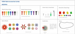 - Zawartość zestawu: stół, 128 kolorowych kołeczków, 128 kolorowych śrubek, 64 geometryczne kołeczki, 2 zestawy narzędzi (klucz, śrubokręt z wymiennymi bitami – łącznie 12 elementów), 20 kół zębatych, 1 uchwyt koła, łańcuch