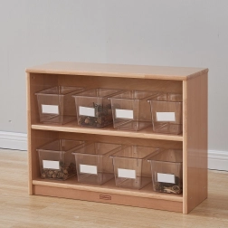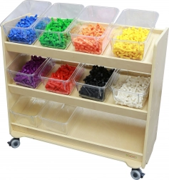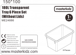 Pudełka są kompatybilne ze specjalnym regałem MASTERKIDZ (ME13095), który mieści do 12 pojemników i umożliwia przejrzyste przechowywanie na półkach lub przenoszenie całego zestawu na wózku. Wersja bez pokrywek ułatwia dzieciom samodzielną obsługę i przyspiesza sprzątanie oraz przygotowanie do kolejnej aktywności.
