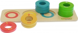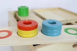 Ten drewniany zestaw edukacyjny łączy zabawę z nauką. Dzieci nakładają kolorowe krążki na kołki, sortują je według koloru i liczby, a przy tym ćwiczą liczenie od jednego do czterech. Każdy krążek jest oznaczony liczbą i słowem po angielsku, co naturalnie rozwija świadomość językową.