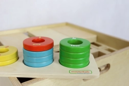 Nawlekanie i układanie krążków na kołkach ćwiczy chwyt, koordynację ręka–oko oraz precyzję ruchów.