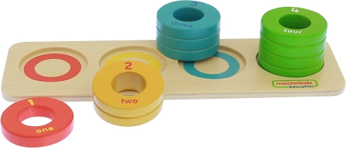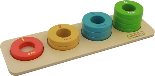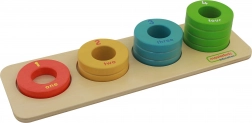 Krążki w czterech intensywnych kolorach, z liczbami i angielskimi podpisami słownymi, pomagają dzieciom intuicyjnie zrozumieć kolory i liczby.
