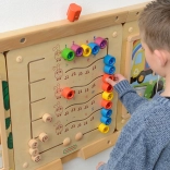 Po lewej stronie znajdują się przesuwne przełączniki do ustawiania zadań – dzieci mogą trenować liczenie w górę i w dół do 5, dopasowywać ilości i kolory oraz ćwiczyć myślenie logiczne. Oprócz rozwoju małej motoryki i koordynacji ręka–oko zabawka pomaga także w koncentracji oraz percepcji wzrokowej.