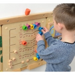 Ta solidna drewniana tablica ścienna MASTERKIDZ przedstawia pięć kolorowych gąsienic i 15 przesuwnych „klejnotów” w pięciu kolorach. Dzieci mogą poruszać nimi po krętych torach, ale nie można ich wyjąć, co zapewnia bezpieczną i długotrwałą zabawę w domu i w przedszkolach. Tablica pokazuje pięć sposobów zobrazowania liczb 1–5: cyfry, palce, kreski, bloki i kropki.