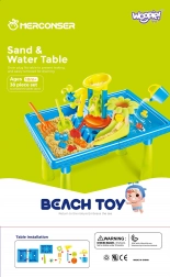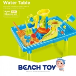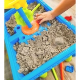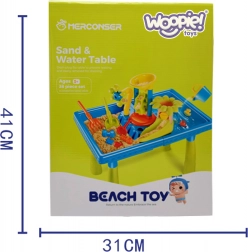 W opakowaniu znajdziesz: stół na wodę, konewka, 3 młynki wodne, 2 łopatki, sitko i 12 foremek.
