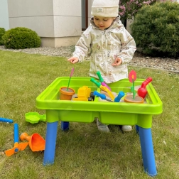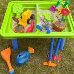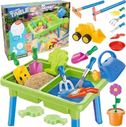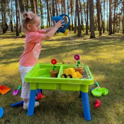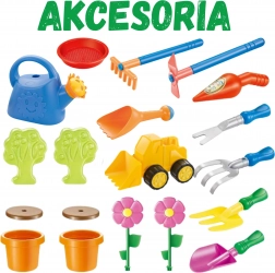 Konewka, łopatki, grabki, foremki, doniczka z kwiatkiem oraz mała wywrotka poszerzają możliwości zabawy i pobudzają dziecięcą wyobraźnię.