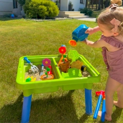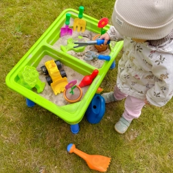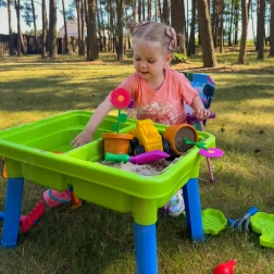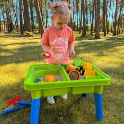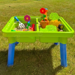 Bogate wyposażenie 13 akcesoriów (konewka, łopatki, grabki, foremki, małe autko–wywrotka, doniczka z kwiatkiem i inne) pobudza wyobraźnię, rozwija motorykę małą oraz wspiera samodzielną i wspólną zabawę. Idealny do ogrodu, na taras, plażę i do pokoju dziecięcego.