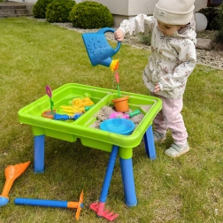 Oddzielne komory umożliwiają jednoczesną aktywność wodną i piaskową – dzieci mogą nalewać, przesypywać i formować bez mieszania materiałów.