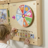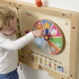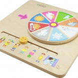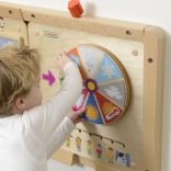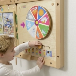 Za pomocą obrotowego koła i suwaka na tablicy dzieci mogą poznawać różne warunki pogodowe oraz to, co warto w tych warunkach założyć.