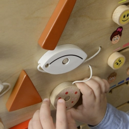 Tablica łatwo działa w ramie na ścianie oraz samodzielnie na stole lub podłodze. Jest solidna, bezpieczna i idealna do podejścia Montessori – nauki poprzez aktywność sensoryczną i praktyczną.