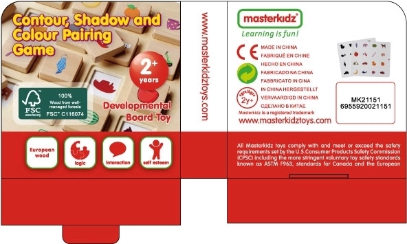 Wymienne karty z identycznymi obrazkami, kolorowymi sylwetami i czarnymi cieniami umożliwiają płynny rozwój umiejętności – od łatwego dopasowywania aż po abstrakcyjne postrzeganie kształtów.