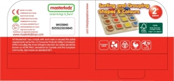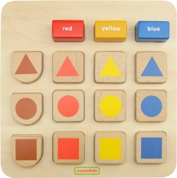 Ta wysokiej jakości drewniana pomoc dydaktyczna marki MASTERKIDZ rozwija rozpoznawanie kształtów (koło, kwadrat, trójkąt itp.) oraz kolorów (czerwony, żółty, niebieski). Dzieci umieszczają elementy we właściwych miejscach według koloru lub kształtu, a jednocześnie poznają angielskie nazwy nadrukowane na klockach.