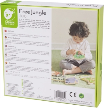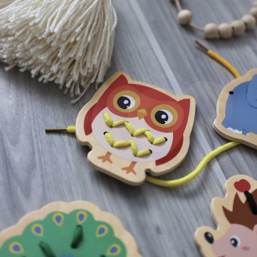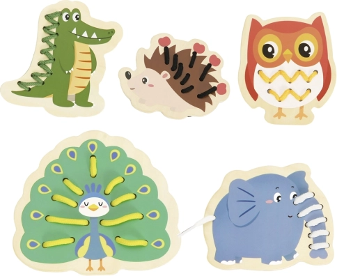 Ten drewniany zestaw do przewlekania zawiera pięć wesołych zwierzątek – słonia, jeża, krokodyla, pawia i sowę – oraz kolorowe sznurki do ich przeplatania. Dzieci najpierw dopasowują części, takie jak głowa, nogi, uszy czy ogon do podstawy zwierzątka, a następnie łączą je sznurkiem. Prosta aktywność daje mnóstwo radości, a jednocześnie celowo wzmacnia umiejętności ważne dla przedszkolaków.