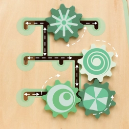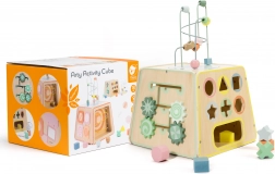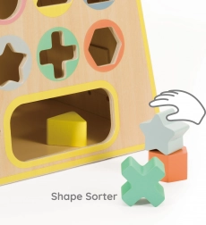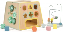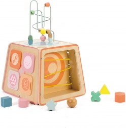 Labirynt z koralikami, zębate kółka, suwaki i sorter kształtów przyciągają uwagę dziecka i wspierają koncentrację oraz logiczne myślenie.