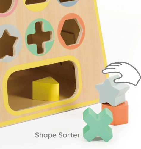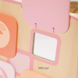 Dzięki różnorodnym aktywnościom – od sortera kształtów i toru kulkowego po obracające się zębate kółka, suwaki i labirynt koralików – dzieci ćwiczą logiczne myślenie, cierpliwość i koncentrację. Tajemnicze drzwiczki oraz lusterko pobudzają ciekawość i zabawę w chowanego.