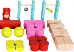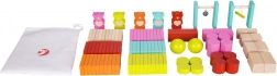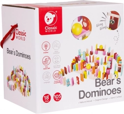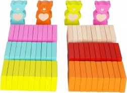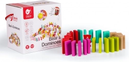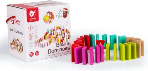 Ten barwny zestaw drewnianego domina zapewnia dzieciom zabawę na długie godziny. Zawiera prostokątne klocki, figurki niedźwiadków, walce, kostki, kule, bramki z dzwoneczkiem oraz z poprzeczką, a także materiałowy woreczek. Połączenie naturalnego drewna i sześciu wyrazistych kolorów inspiruje do kreatywności, budowania torów i kolorowych sekwencji.