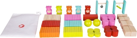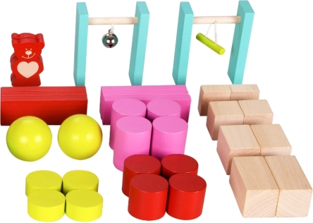 - Prostokątne klocki, figurki niedźwiadków, kule, walce, kostki, prostopadłościany, bramka z dzwoneczkiem, bramka z poprzeczką