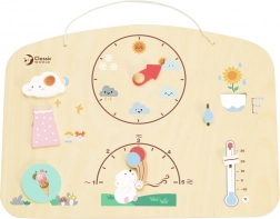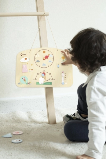 Ta sprytna i zabawna tablica pomaga dzieciom zrozumieć, co dzieje się za oknem. Poprzez proste przekręcanie i przesuwanie elementów dzieci samodzielnie ustawiają aktualną pogodę i uczą się ją prawidłowo nazywać. Dzięki solidnemu drewnianemu wykonaniu oraz bezpiecznym, nietoksycznym farbom tablica jest idealna do pokoju dziecięcego, przedszkola i w podróży.