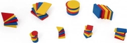 Bogaty zestaw figur geometrycznych w kolorze czerwonym, żółtym i niebieskim motywuje dzieci do układania wzorów, segregowania oraz rozpoznawania kształtów i kolorów.