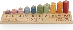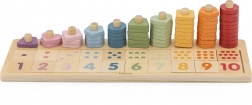 To drewniane liczydło zawiera 55 kolorowych krążków, 20 bloków z liczbami i kropkami, 1 podstawę i 10 kołków, co łącznie daje 86 elementów. Produkt wykonany jest z bezpiecznych materiałów i pomalowany hipoalergicznymi farbami, które są bezpieczne dla dzieci.