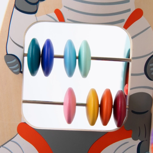 Łączy zabawę i naukę dzięki elementom takim jak zegar do nauki czasu, lusterko i interaktywne elementy kosmiczne.