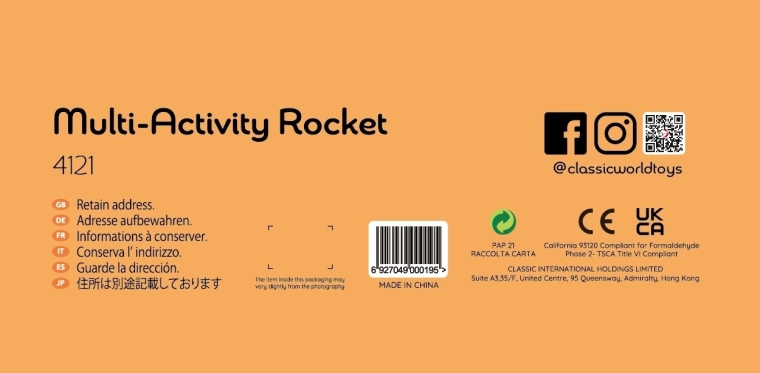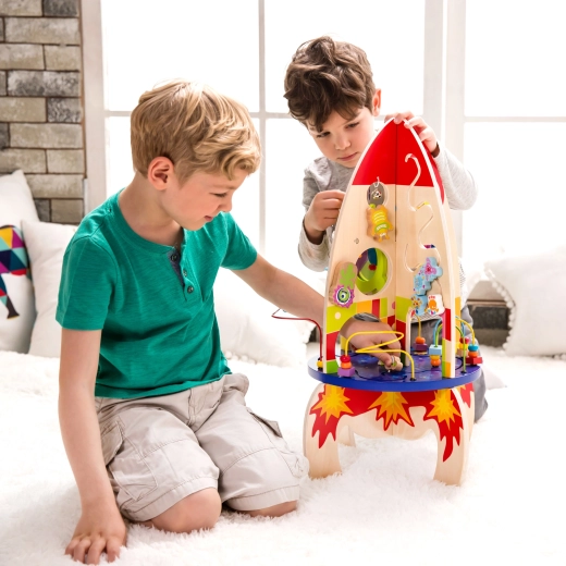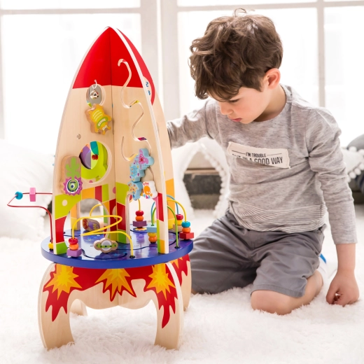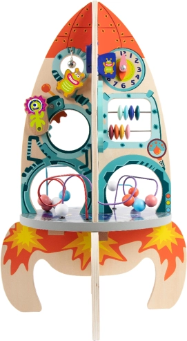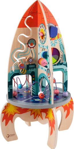Rakieta zawiera różne interaktywne elementy, takie jak labirynty, kolorowe koraliki, zegar do nauki czasu oraz lusterko. Wszystkie te elementy zaprojektowano tak, aby wspierały małą motorykę i kreatywność.