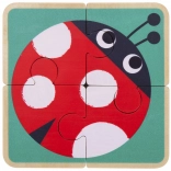 - 6 aktywności w jednym: drewniane puzzle 4-elementowe, piesek do ciągnięcia na kółkach, koraliki do nawlekania z drewnianą igłą i woreczkiem, aktywny trójkąt (sorter, labirynt, zębate koła, liczydło), obrotowe kostki z obrazkami, książeczka obrazkowa „Small and Big”.