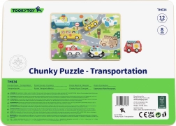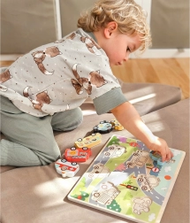 Siedem wielobarwnych elementów aut, statków i samolotów dzieci dopasowują do odpowiednich kształtów. Zabawa jest intuicyjna, motywująca i rozwija pierwsze umiejętności sortowania.