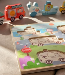 Ta drewniana montessori układanka oferuje dzieciom naukę przez zabawę. Zestaw tworzy solidna plansza z wycięciami oraz 7 elementów pojazdów (np. auto, taksówka, policja, karetka, straż pożarna, samolot, statek), które dzieci dopasowują zarówno do kształtu, jak i obrazka. Dzięki wyrazistym kolorom i czytelnym konturom dzieci szybko zrozumieją zasadę dopasowywania, a każdy poprawnie włożony element przynosi poczucie sukcesu.