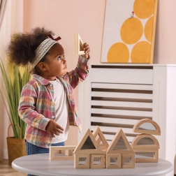 Zabawa rozwija koordynację oko–ręka, myślenie logiczne i wyobraźnię przestrzenną. Dzieci budują, sortują i eksperymentują z symetrią oraz równowagą.