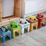 W zestawie znajduje się 5 wytrzymałych drewnianych autek (np. straż pożarna, policja, karetka, autobus szkolny, śmieciarka) z cichym i płynnym toczniem.