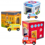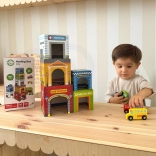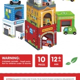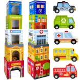 Pięć ponumerowanych kostek z otworami pozwala budować wieże, wkładać pojazdy do środka i w zabawny sposób odkrywać miasto – idealne do rozwoju wyobraźni.