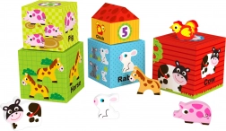 Numerowane klocki z wyraźnymi ilustracjami uczą dziecko rozróżniania rozmiarów, liczenia i zapoznają z angielskimi nazwami zwierząt – naturalnie, podczas zabawy.