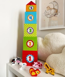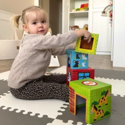 Klocki wykonane są z wysokiej jakości kartonu i malowane nietoksycznymi farbami. Można je wkładać jedno w drugie, aby oszczędzić miejsce, oraz używać do przechowywania drobiazgów.