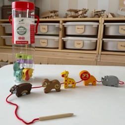Nawlekanie drewnianych zwierzątek na sznurek wzmacnia paluszki, poprawia chwyt oraz trenuje precyzję i koncentrację.